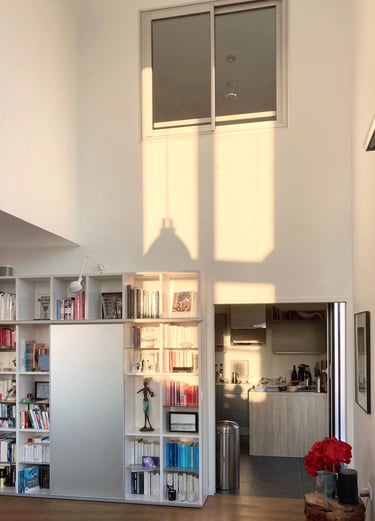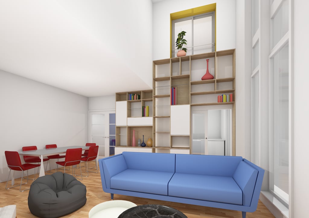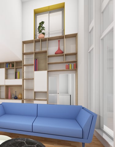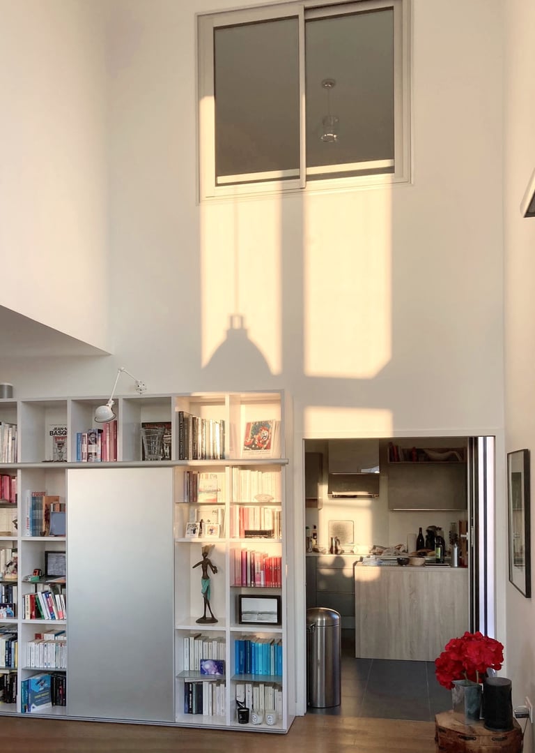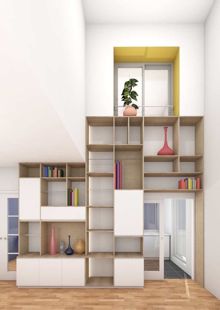 Cette intervention, bien que ponctuelle, s’inscrit dans une réflexion globale sur l’équilibre entre fonctionnalité et mise en valeur architecturale de l'espace de vie. Le meuble projeté devient une pièce maîtresse de l’espace, à la fois sculpturale et utilitaire, en dialogue direct avec la hauteur spectaculaire du séjour.