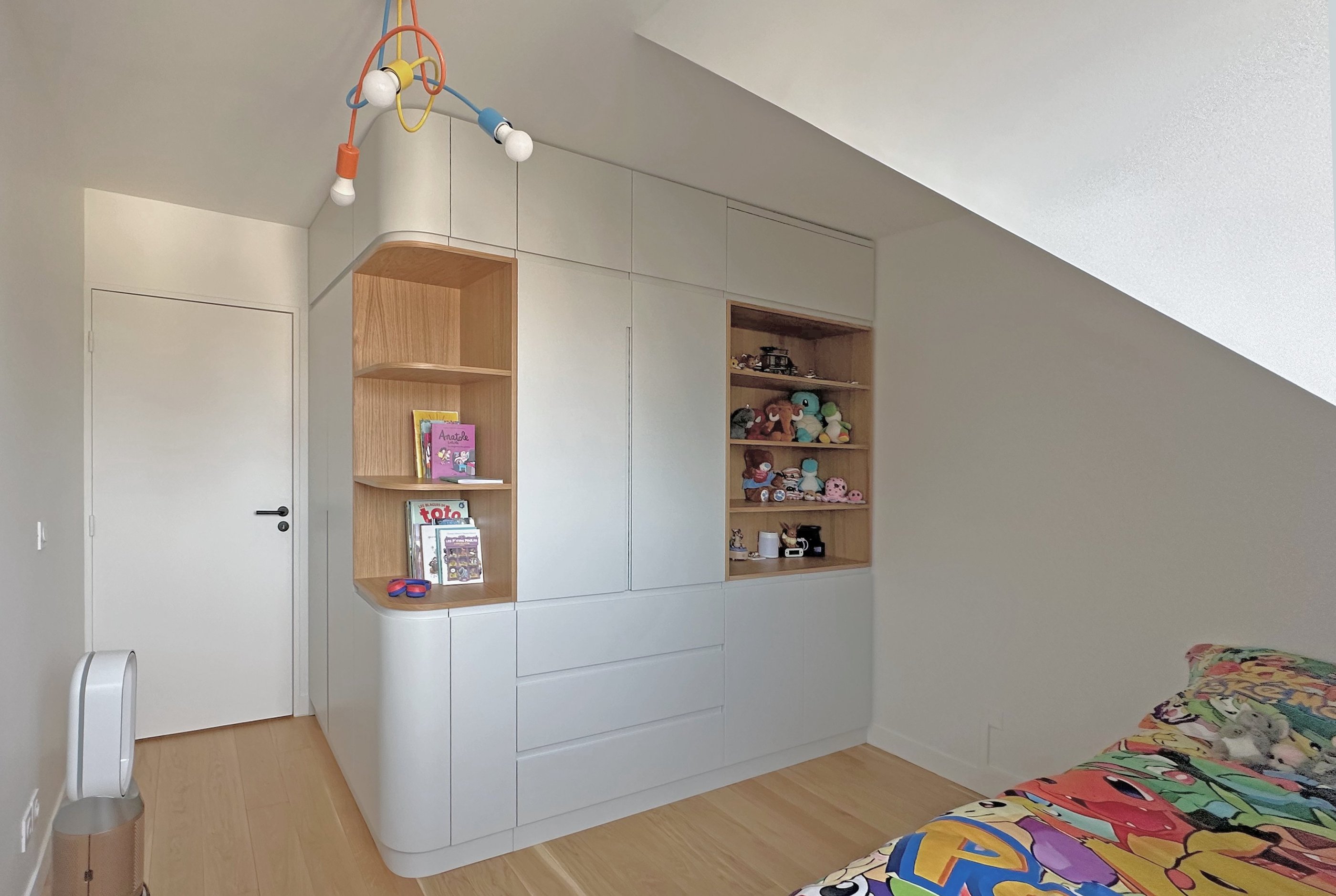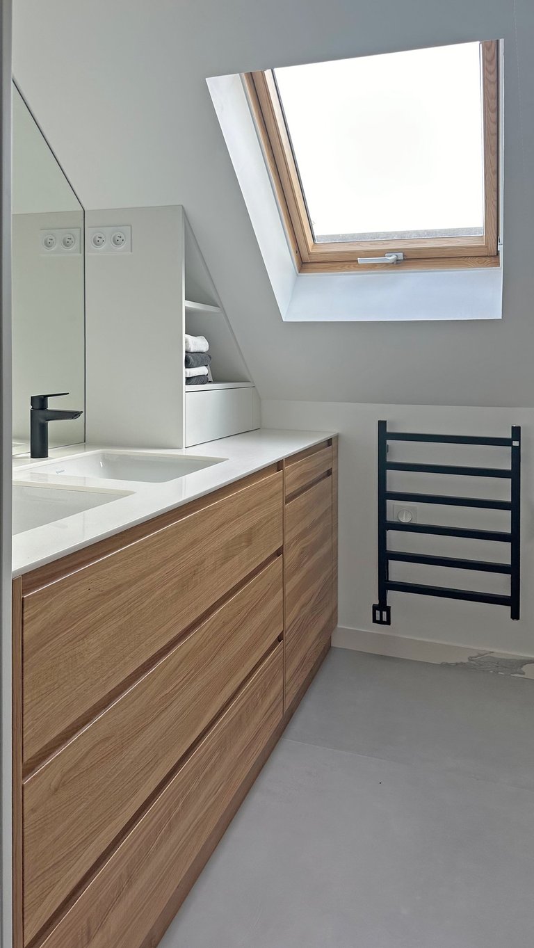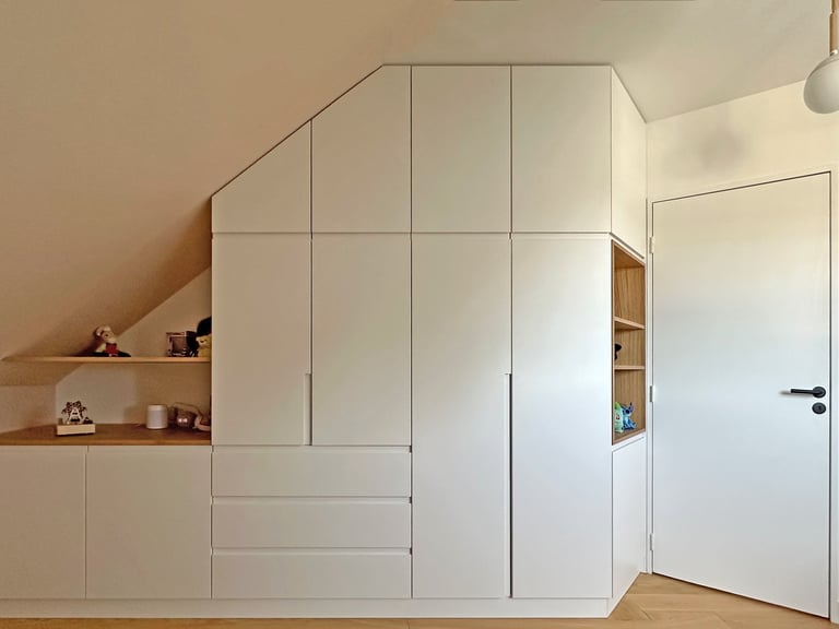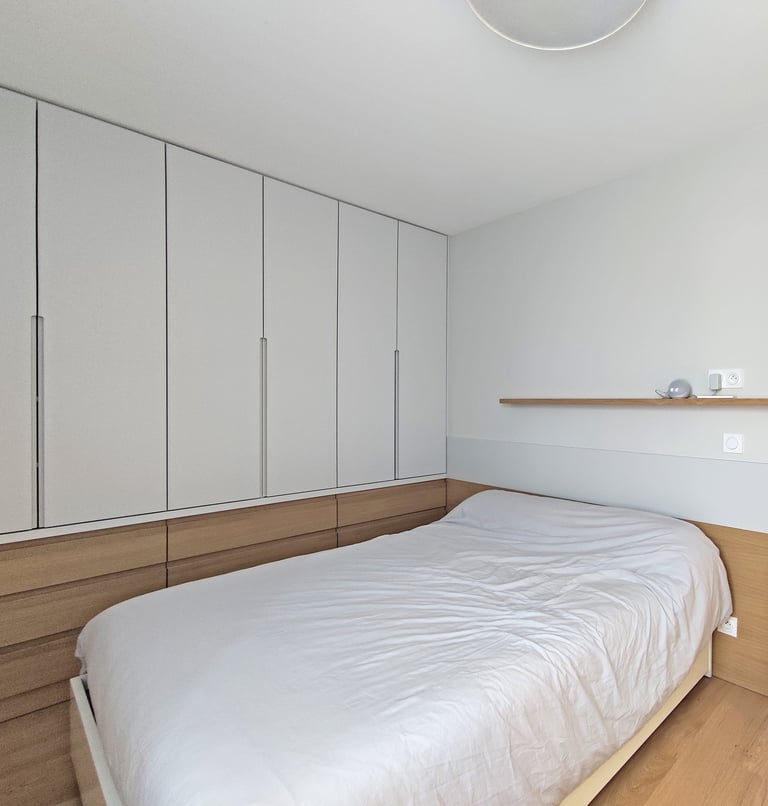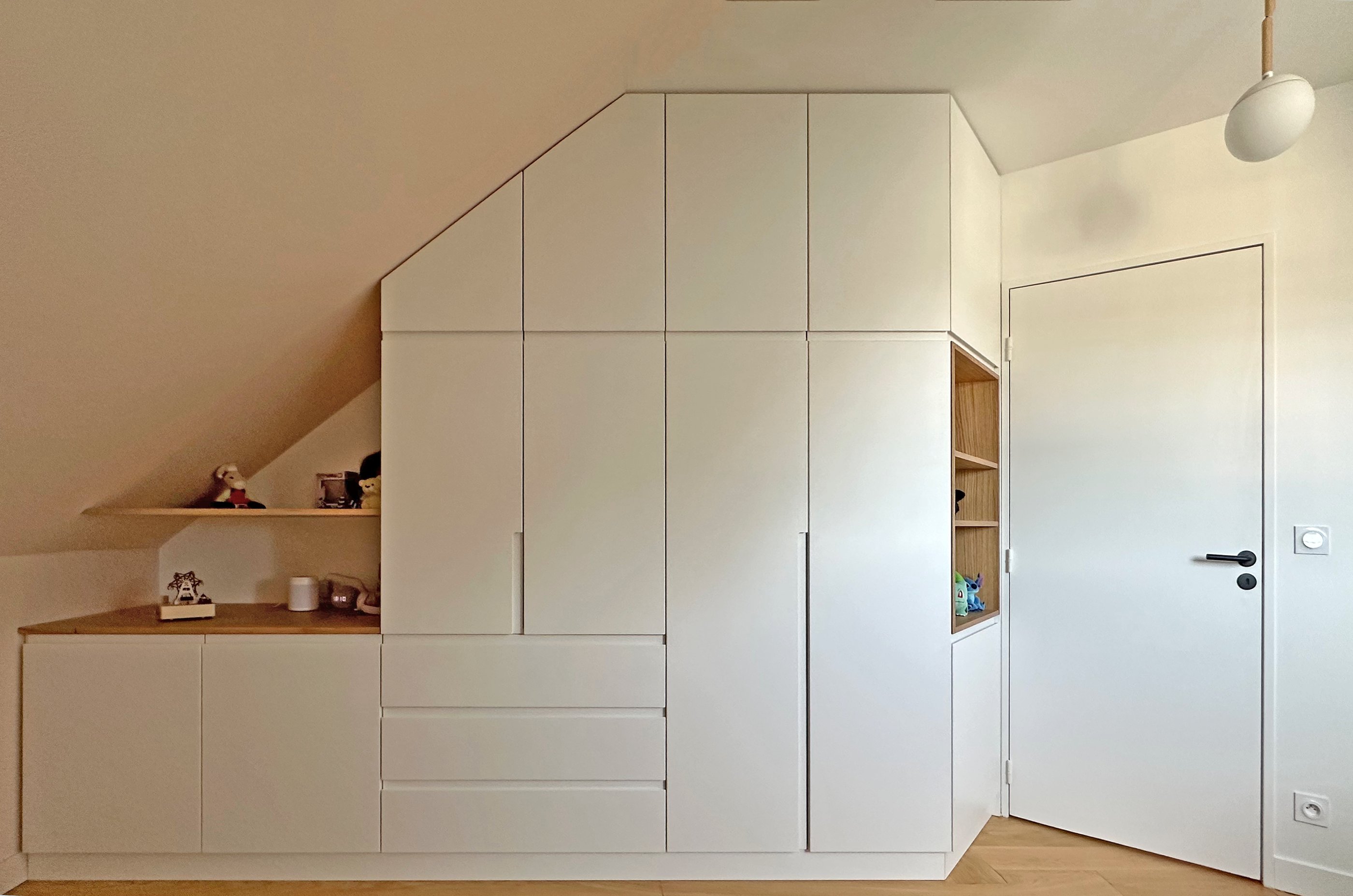 L’intervention principale a porté sur la création d’une suite parentale intégrant un dressing et une salle de douche attenante. Les contraintes de l’espace mansardé ont été traitées avec finesse grâce à la conception de mobilier sur mesure, parfaitement adapté aux pentes de toit et aux hauteurs variables.