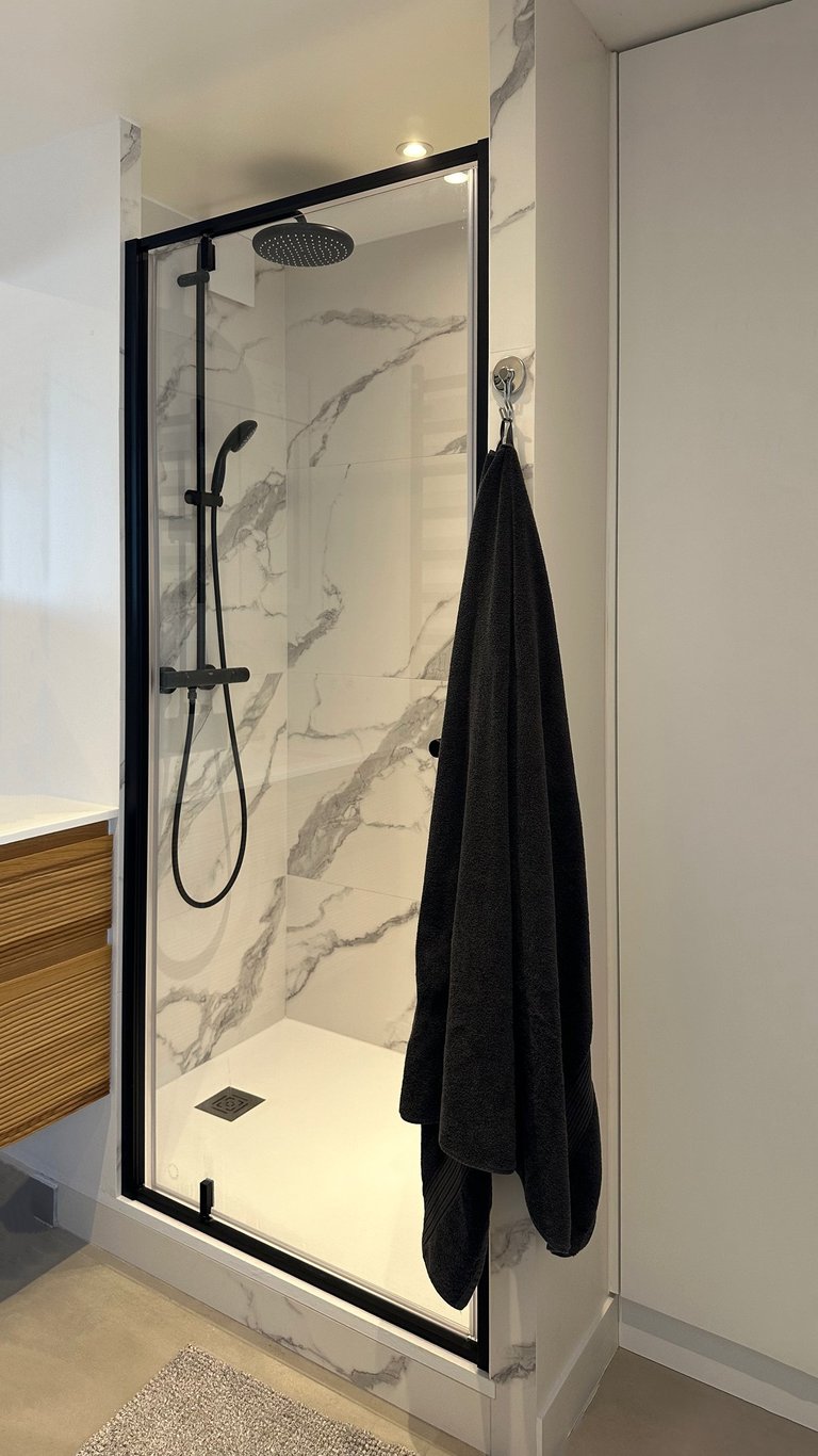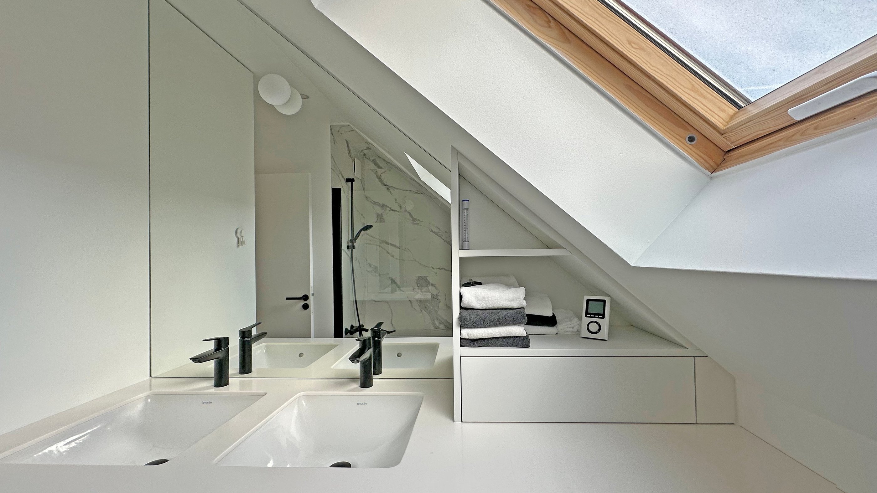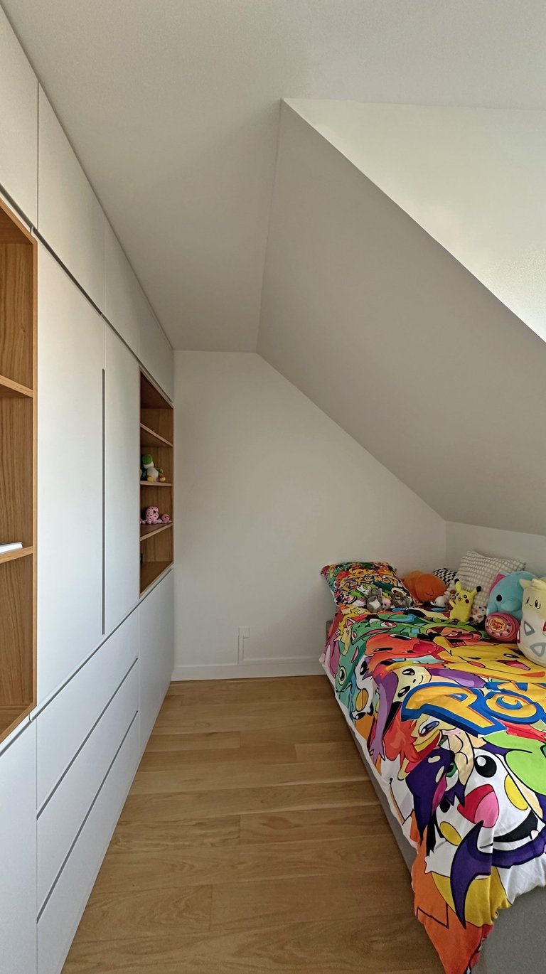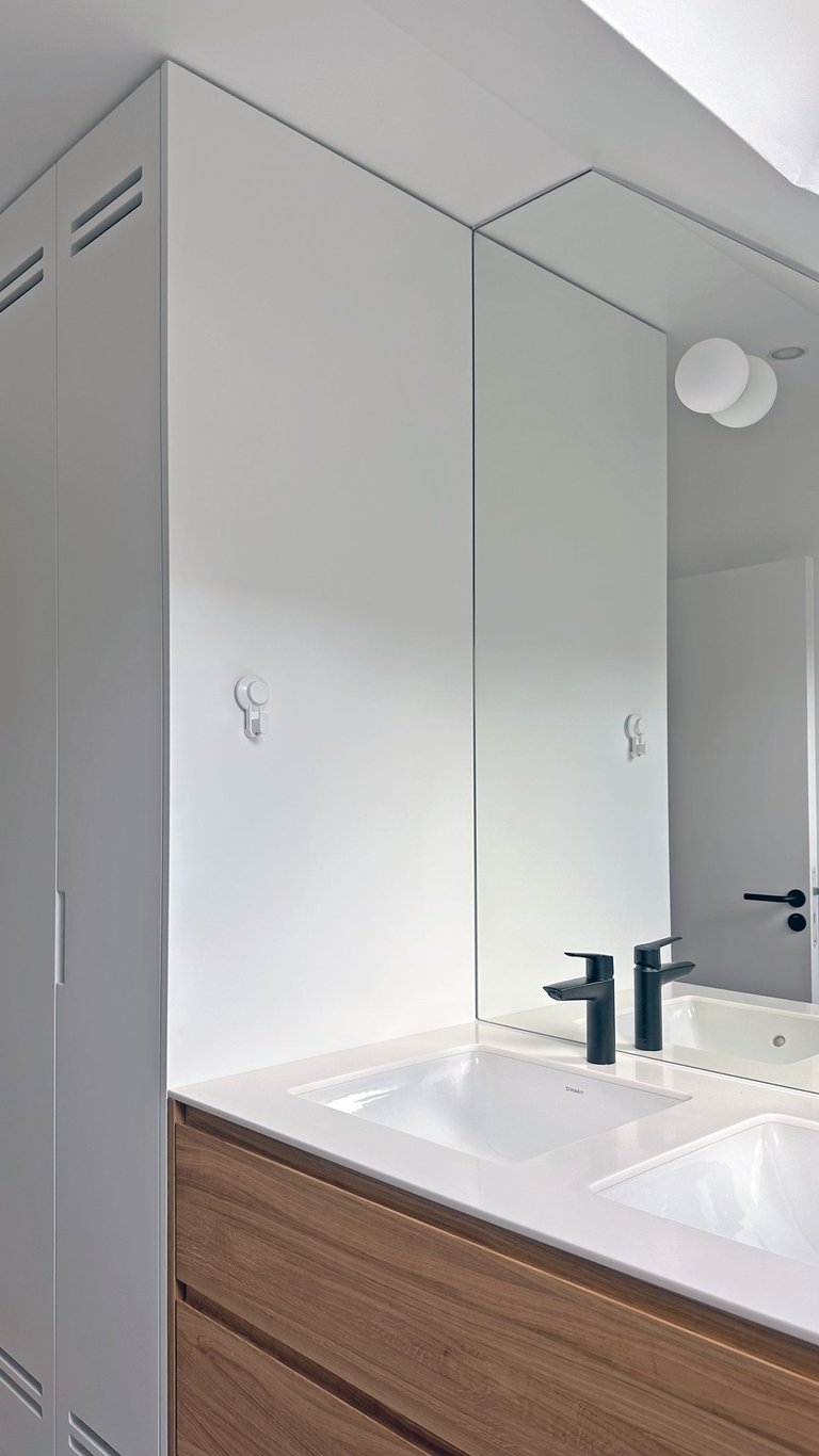 L’intervention principale a porté sur la création d’une suite parentale intégrant un dressing et une salle de douche attenante. Les contraintes de l’espace mansardé ont été traitées avec finesse grâce à la conception de mobilier sur mesure, parfaitement adapté aux pentes de toit et aux hauteurs variables.