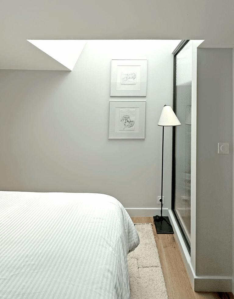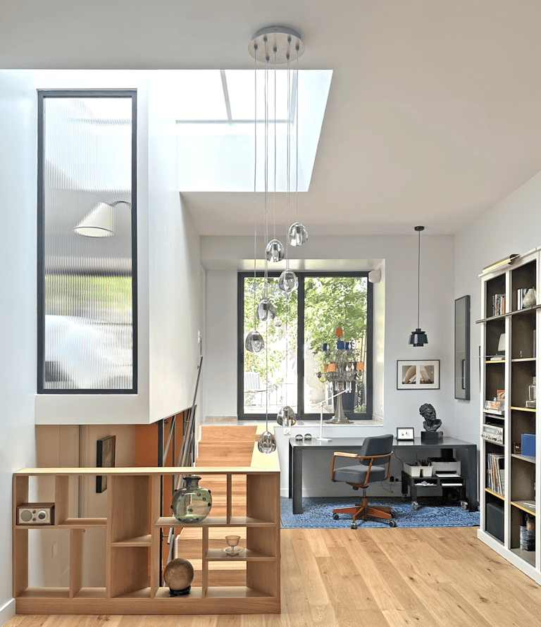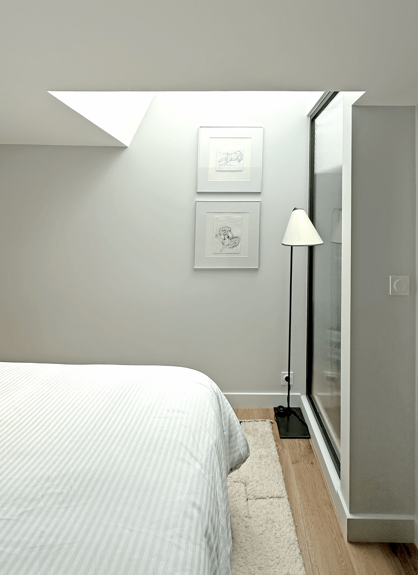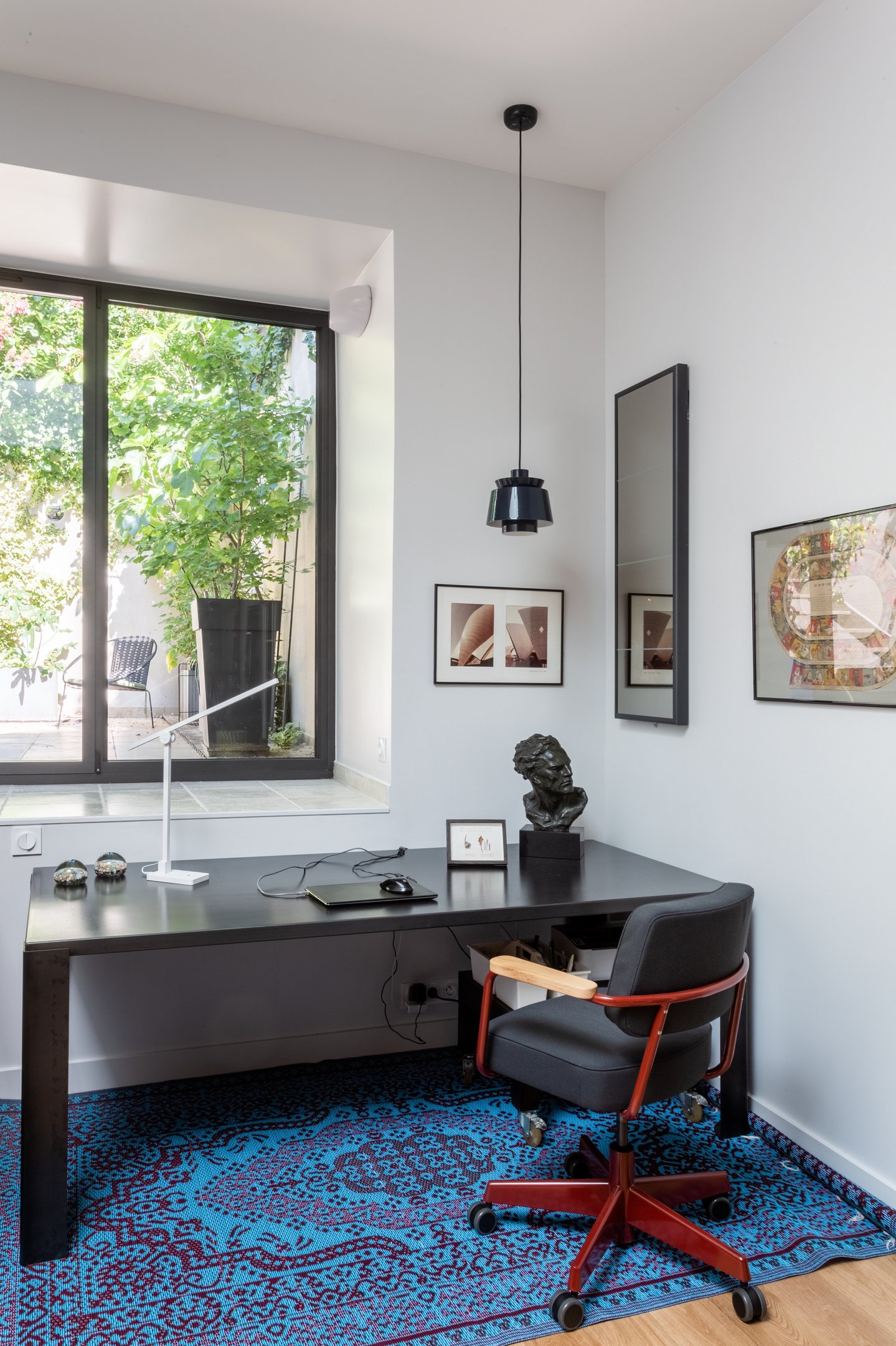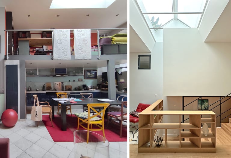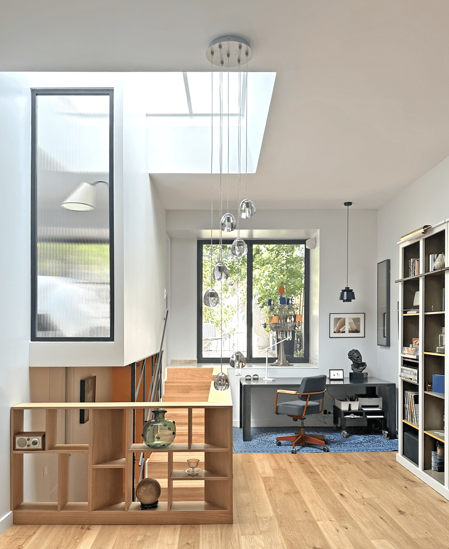 La propriétaire, Catherine, ne profitait pas de l’espace sous verrière, situé en bout de loft. L’agencement intérieur a été entièrement repensé. Le bureau, initialement situé à l’entrée, a été déplacé à l’arrière du loft, dans un espace baigné de lumière et ouvert sur le jardin. L’ancienne chambre attenante à l’entrée bénéficie désormais d’une salle d’eau privative, offrant plus de confort et d’intimité.