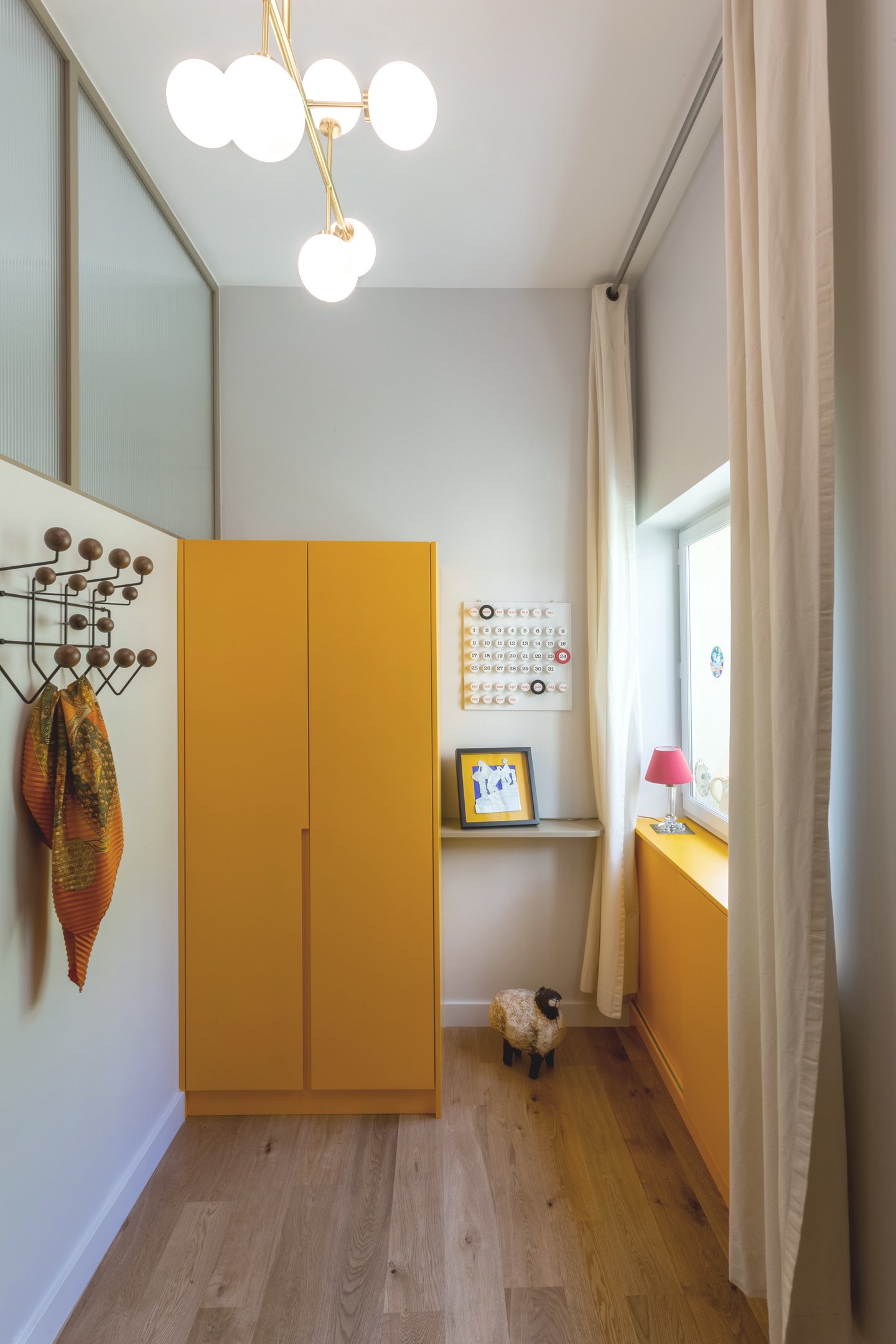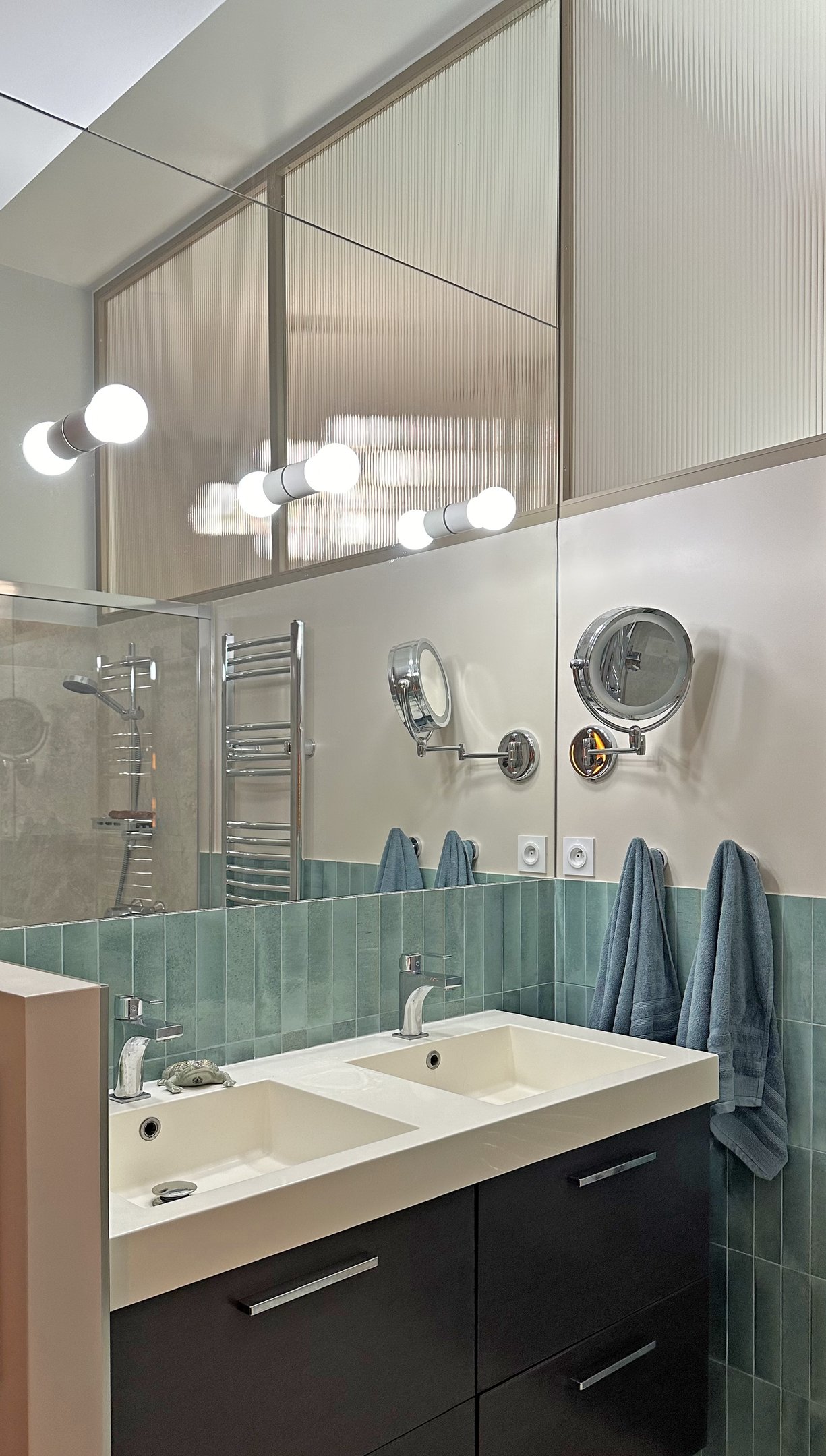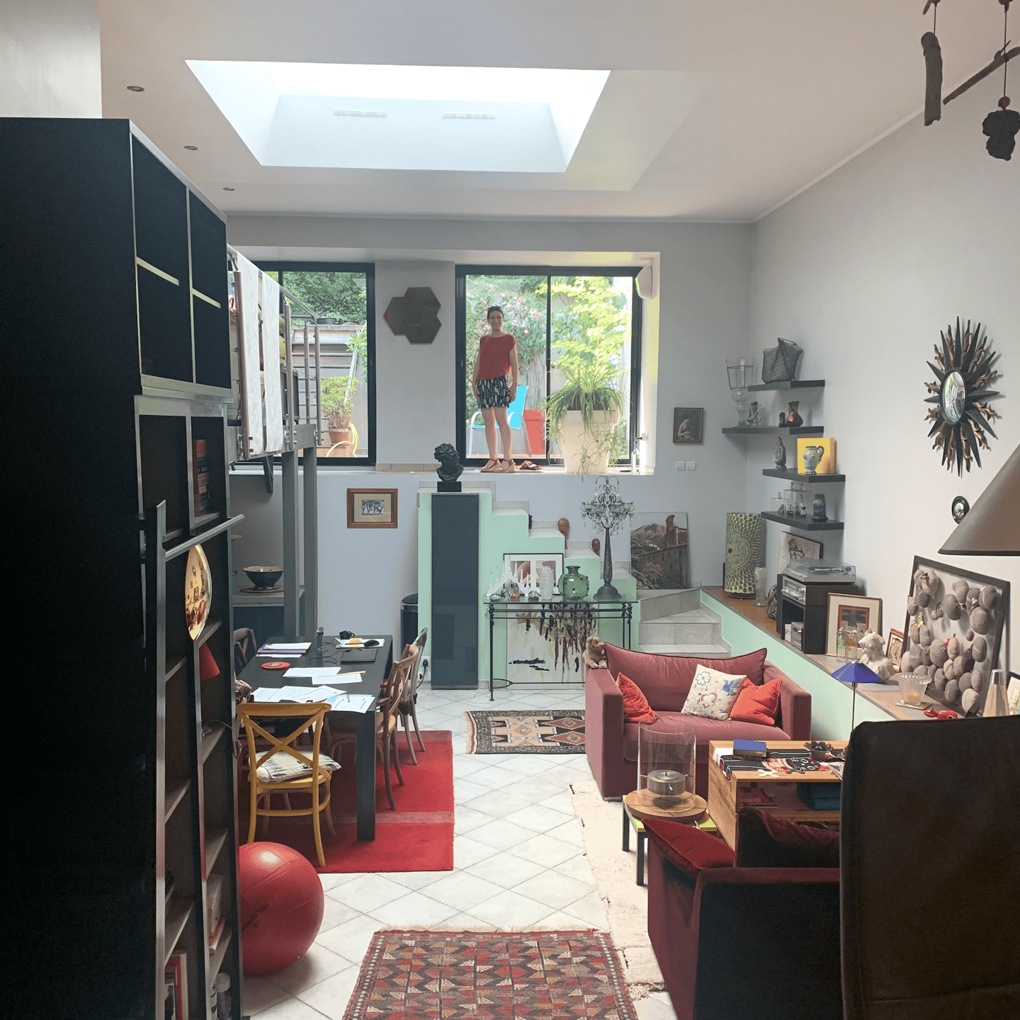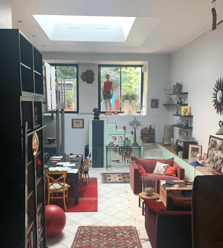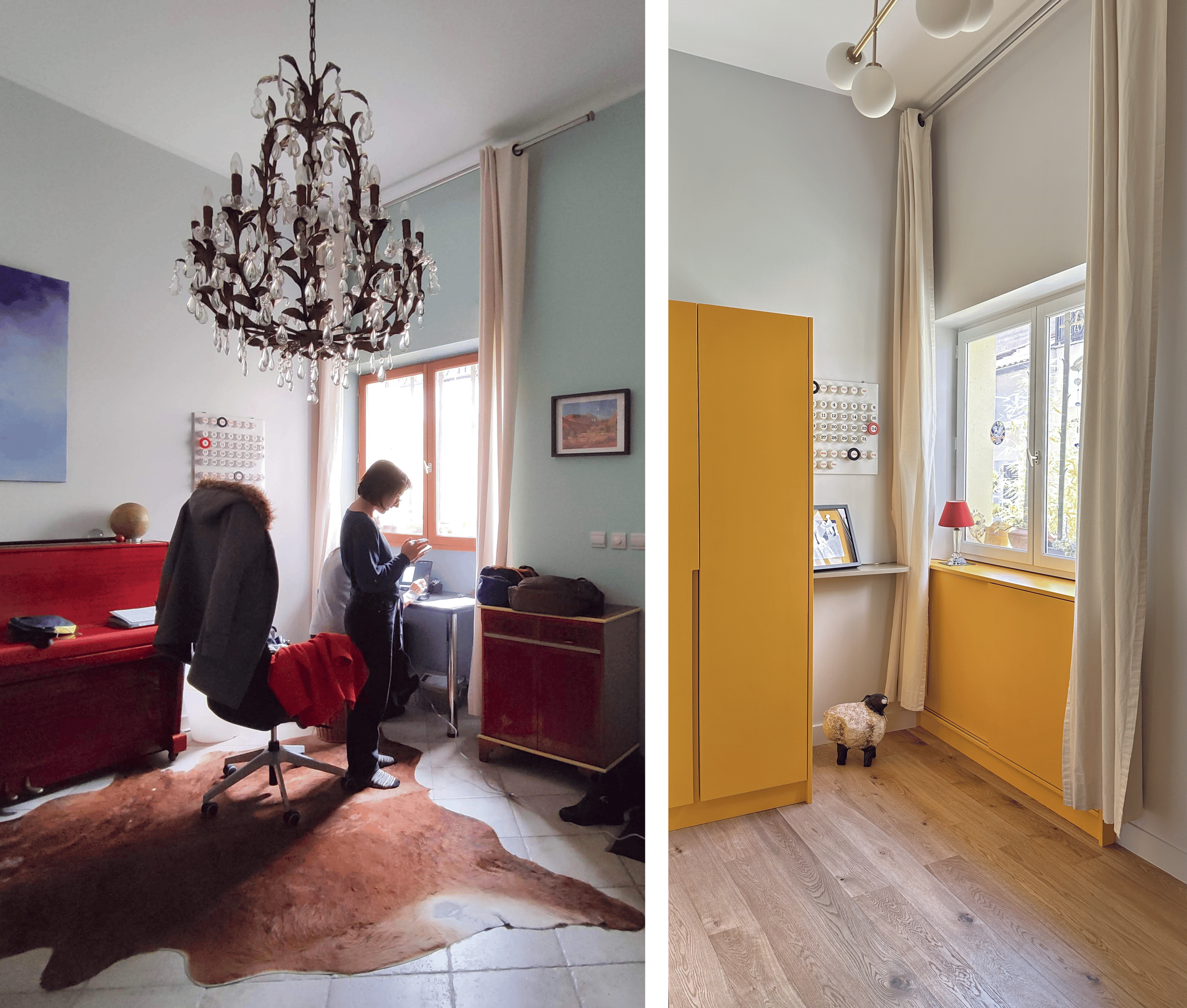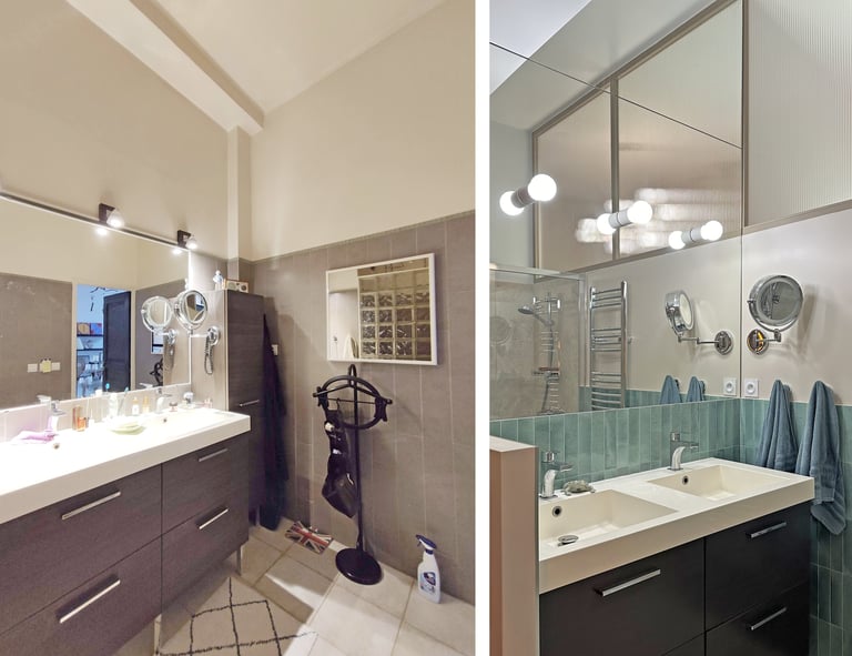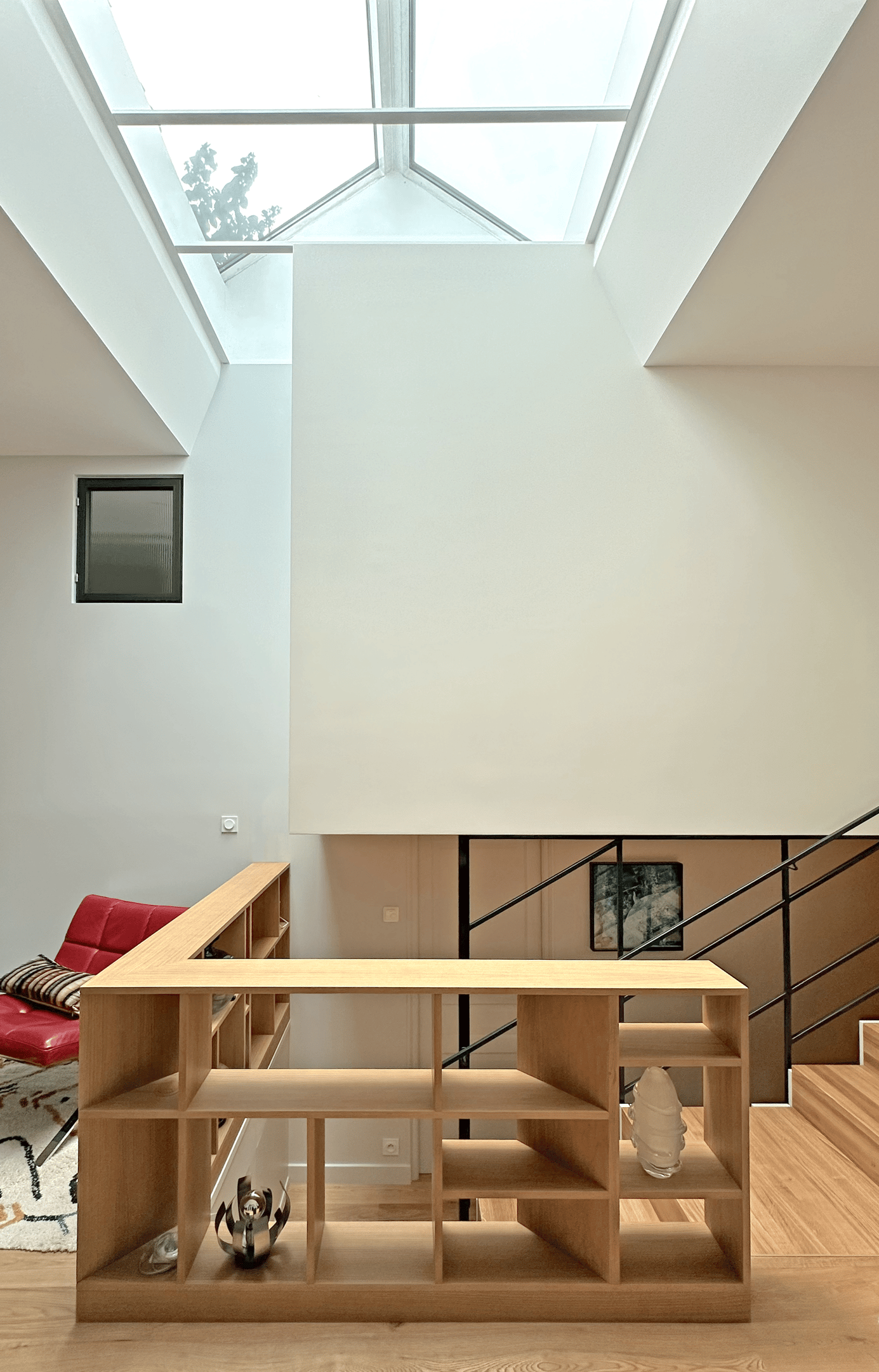 La propriétaire, Catherine, ne profitait pas de l’espace sous verrière, situé en bout de loft. L’agencement intérieur a été entièrement repensé. Le bureau, initialement situé à l’entrée, a été déplacé à l’arrière du loft, dans un espace baigné de lumière et ouvert sur le jardin. L’ancienne chambre attenante à l’entrée bénéficie désormais d’une salle d’eau privative, offrant plus de confort et d’intimité.