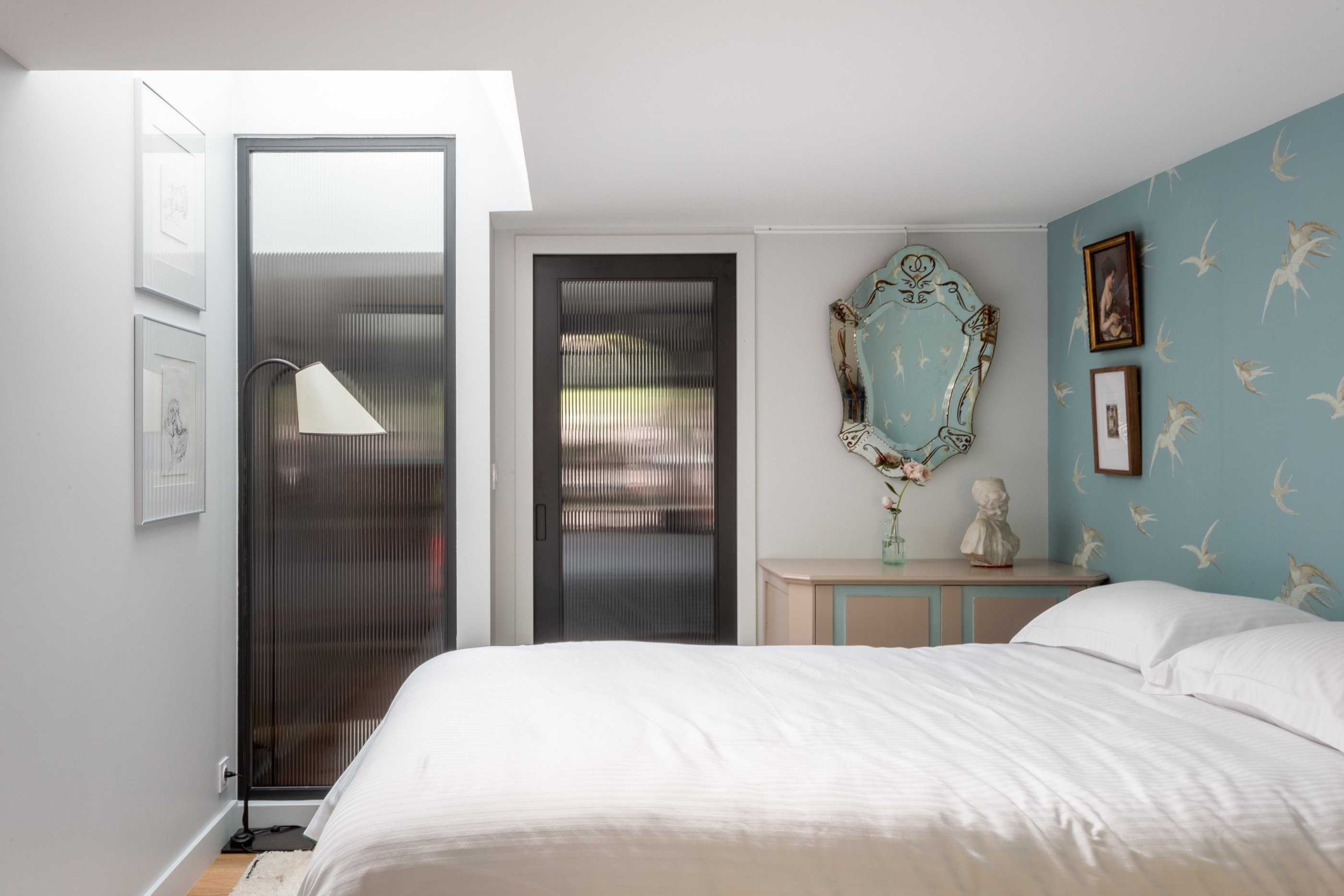 La belle hauteur sous plafond et la linéarité du volume ont permis de jouer avec les niveaux et les pleins/vides, en créant des avancées et des espaces suspendus qui redessinent l’ensemble du lieu. Un volume suspendu sous la verrière accueille désormais une chambre d’amis avec salle d’eau attenante et accès direct au jardin.