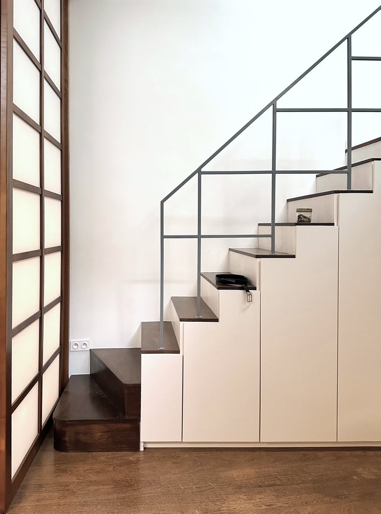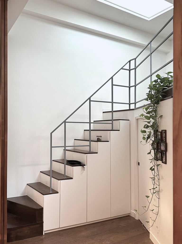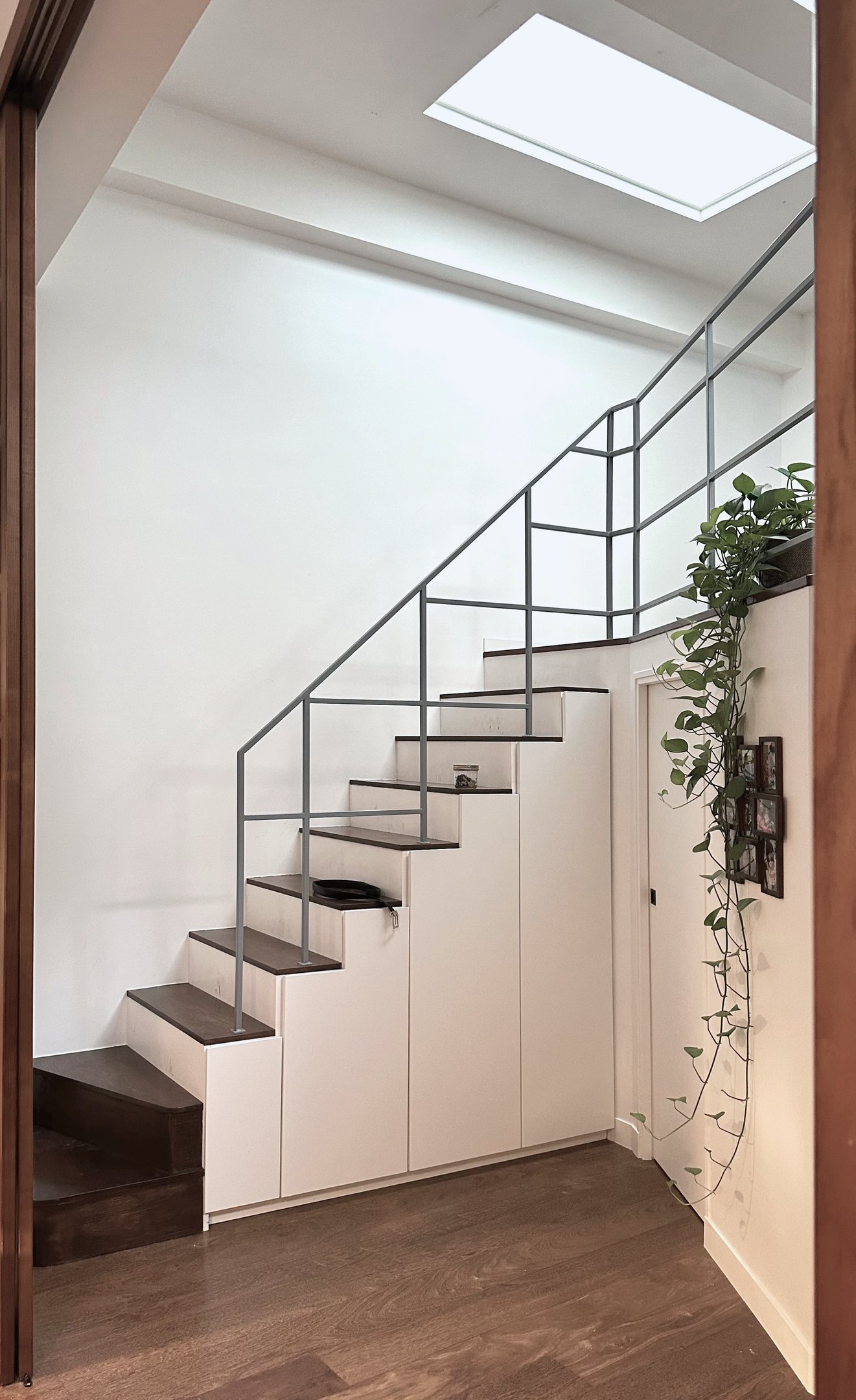 Le nouvel escalier menant à la mezzanine a été conçu comme un meuble-penderie multifonction, optimisant chaque mètre carré avec ingéniosité. Véritable pièce d’architecture, il répond aux besoins pratiques des propriétaires tout en s’intégrant parfaitement à l’esthétique industrielle et chaleureuse du loft.