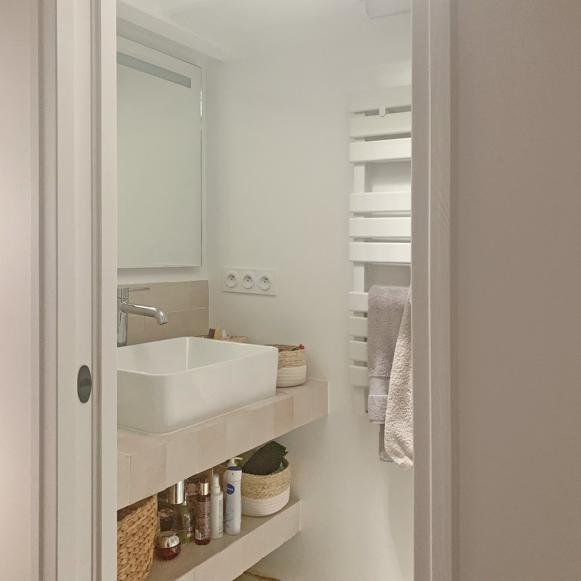 Ce magnifique loft a bénéficié d’une transformation ciblée dans une pièce de 25 m², initialement ouverte sur la salle à manger et salon, où les fonctions de chambre et de bureau n’étaient pas véritablement séparées. L’objectif de cette intervention a donc été de créer une chambre à coucher cloisonnée, accompagnée de sa salle de douche, tout en préservant l’espace bureau en mezzanine.